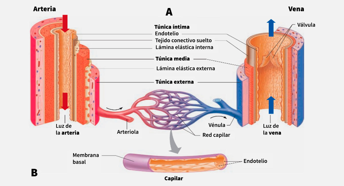 - Las paredes de las venas y arterias constan de tres túnicas: la túnica íntima (endotelio con una membrana basal subyacente), la túnica media (músculo liso y fibras elásticas) y la túnica externa (fibras con gran cantidad de colágeno). Los capilares (entre las venas y arterias en la vía circulatoria) sólo están formados por la túnica íntima. La túnica media es gruesa en las arterias y relativamente fina en las venas.